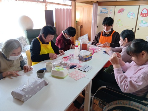 春といえば桜です。可愛らしいピンクの花弁をご利用者様とスタッフでつくりました。飾り付けるのが楽しみです。