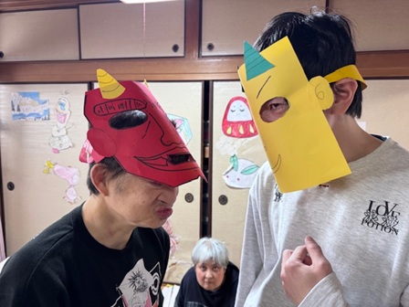 鬼側の利用者さんは午前にお面を作成してる時からお面をつけてスタッフに見せて回っていました。