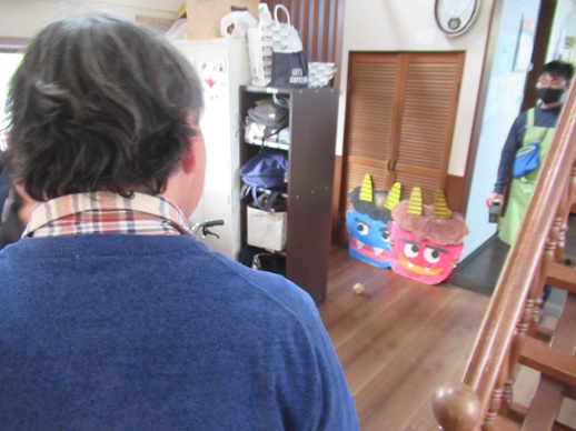 利用者さんとスタッフに鬼の仮面をつけてもらい、他の方たちで袋に入った状態で投げてもらいました。