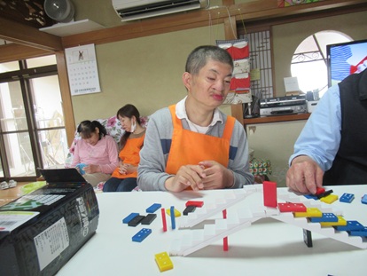 和室ではドミノに挑戦、立てるより倒す方がお好きですが頑張って取り組んでいました。