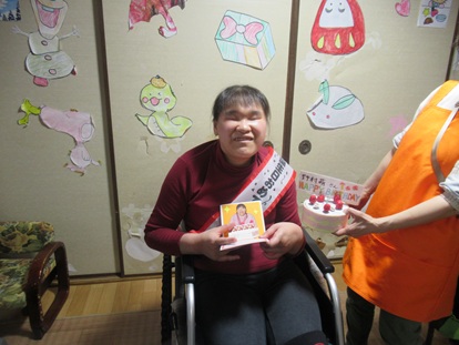 今回から誕生日の方には「お誕生日おめでとう」とかかれたタスキをして、よりいっそう誕生日という事を感じて貰う様にしました。