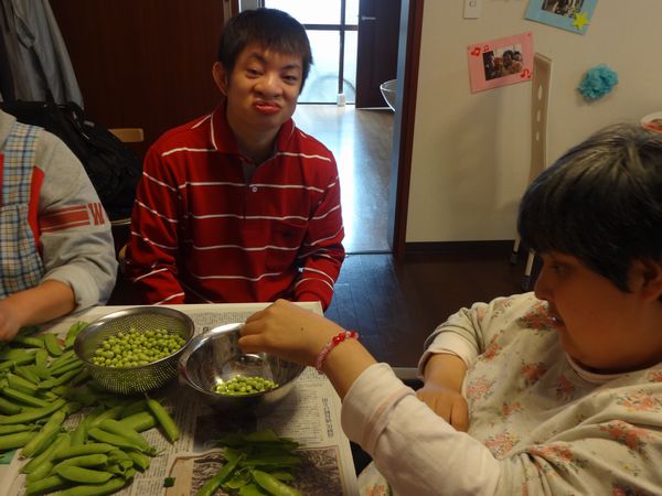 朝は庭で育てたエンドウ豆をみんなで採り、皮をむきました。大量のエンドウ豆にびっくりする方も(^^)