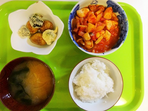 オムライス&きのこカレーかけ トッポギの甘辛炒め なめこと長ネギのみそ汁