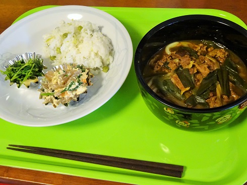 豆ごはん カレーうどん 春菊の白和え 豆苗のからし和え