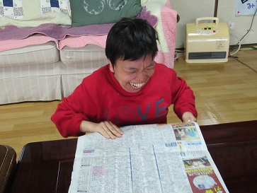 いざ実現すると照れがあるのか、少し離れた場所で新聞を見つめていました(笑)