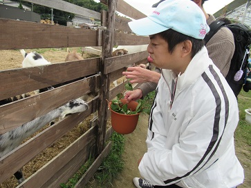山羊に餌をあげられるコーナーがあったので、皆であげました。