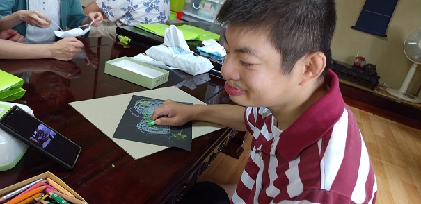 用紙の周辺に星のスタンプを押して、周りには自分の好きな動物や趣味の絵等を描いて行きました。