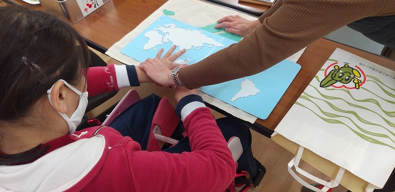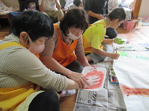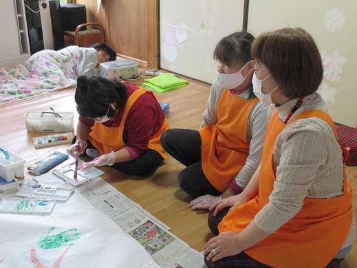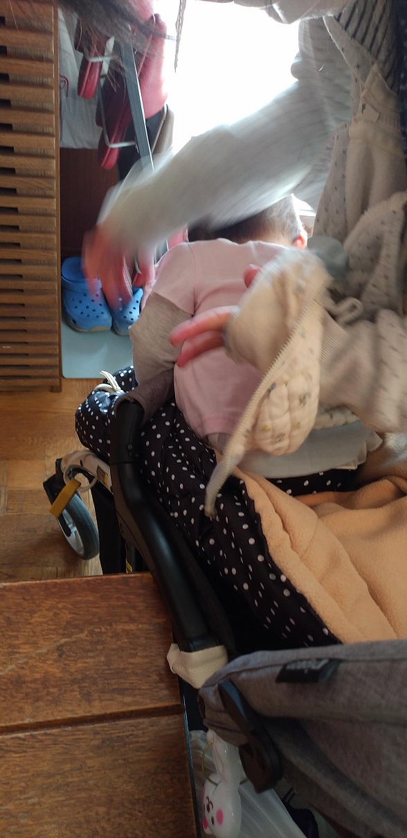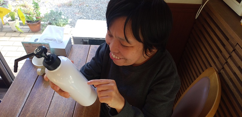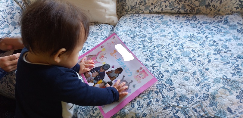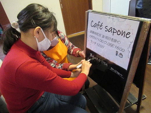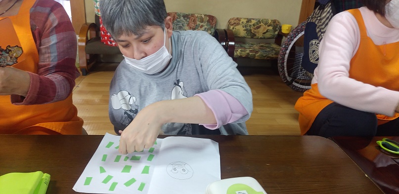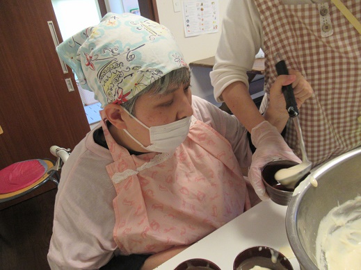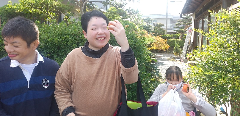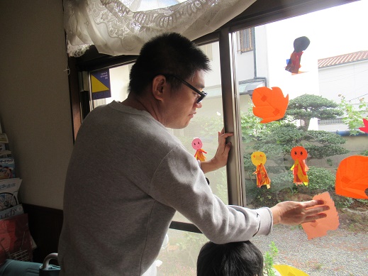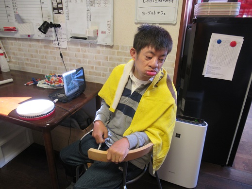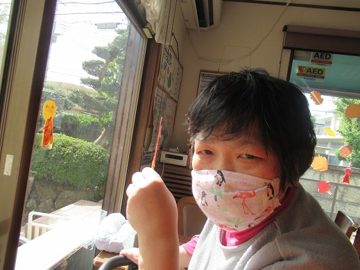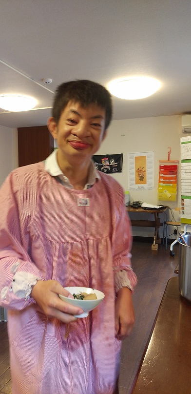 今日は昼食がカレーうどんだったので、服を汚さない様に今日は割烹着を着て貰いました。