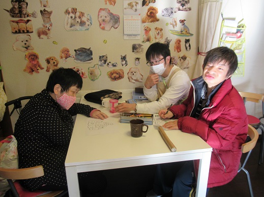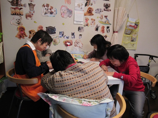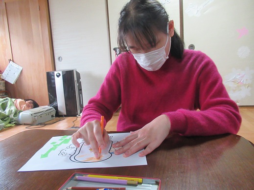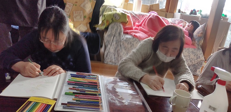 女性の利用者さんはすみっコぐらしの塗り絵に取り組んでいます。