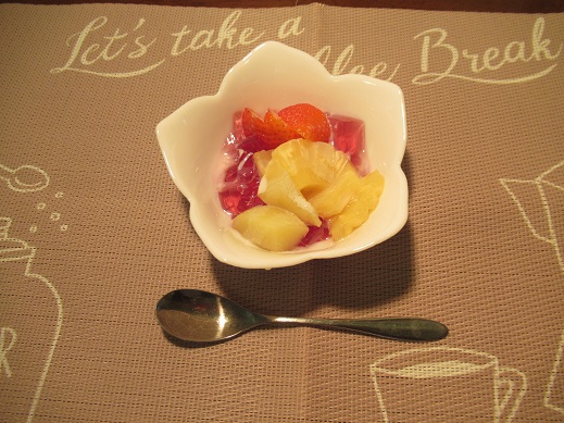 その利用者さんが好きな色々なフルーツとゼリーに練乳をかけたものをおやつの時間みんなで食べました。