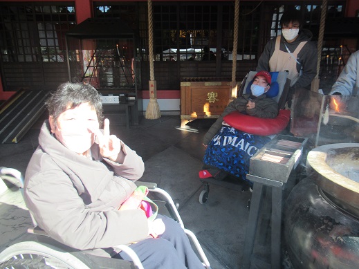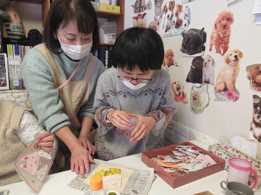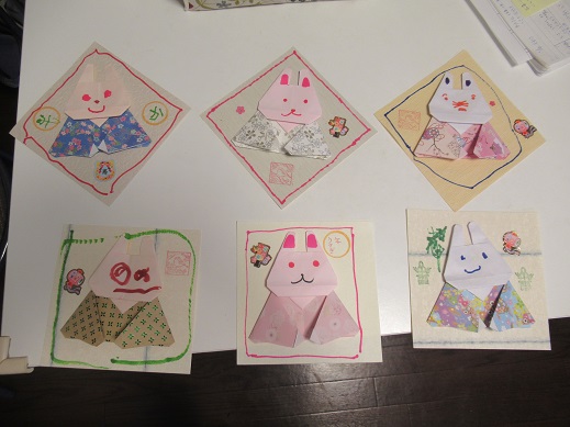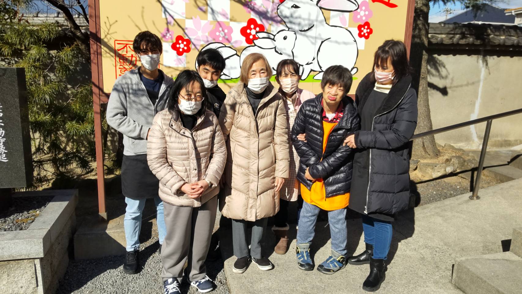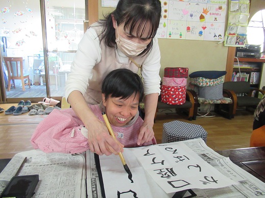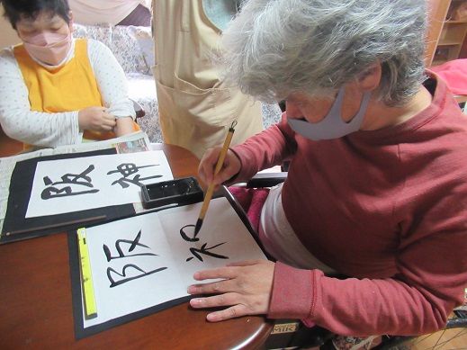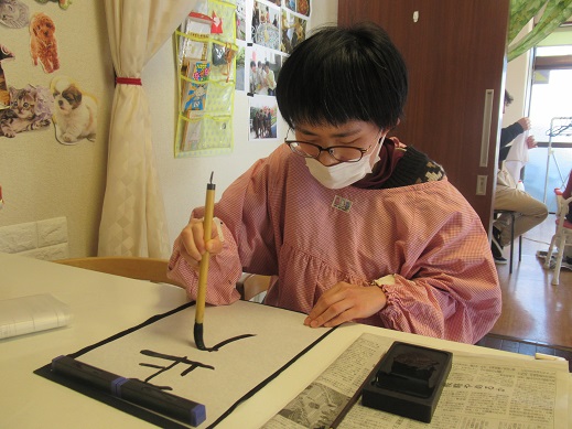 玄関のカフェスペースに1月の創作物と一緒に書初めを貼っています。