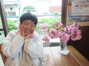 利用者さん宅からいただいた八重桜の前で写真を撮影しました。