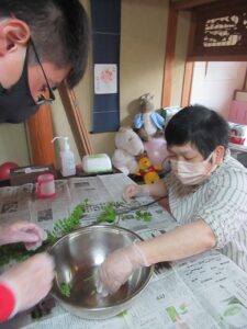 和室である利用者さんの親御さんが持ってきてくださった山椒の葉を、一枚一枚とっていきました。