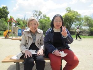 今日は、緑地公園に行きました。ベンチに座ってお菓子を食べながら、ほのぼのと過ごしました。