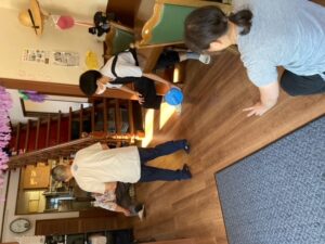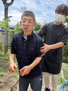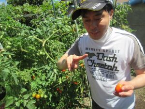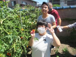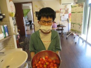 午前中は、庭になっているトマトをみんなで収穫しに行きました。