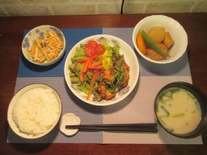 オクラ、山芋、プチトマト、きゅうり、大葉、みょうが、しょうが、ネギ、ゆで卵、しいたけ、わかめ、かぼちゃ