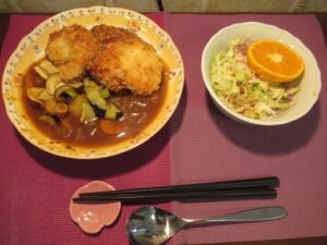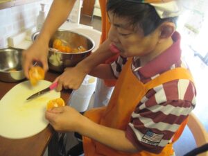ランチ前には、サラダに添えるミカンを切る作業と胸肉に衣をつける作業を一緒にやりました。