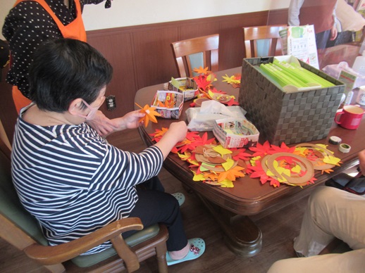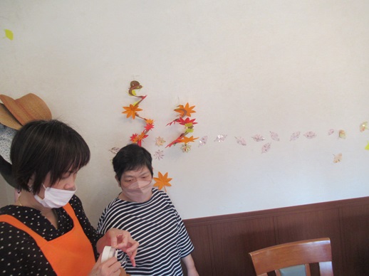 今日はみんなに創作して頂いた紅葉を玄関に貼り付けました。