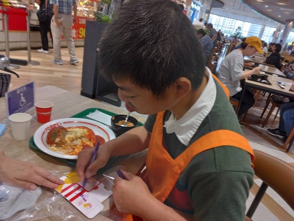 ブザーが震え、ハンバーグオムライスの完成を知らせると、再びぎゅっとブザーを握りしめながら受け取りに向かわれました。