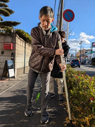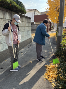 ほうきを利用者さんに持っていただき、協力して綺麗にしていきました。初めはほうきを使って落ち葉を掃くという動作ができない方もスタッフが教えると掃けるようになっていました。