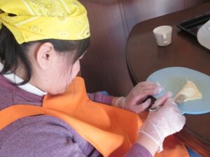 具材をパイ生地の上に乗せたり、三角形に折った後にフォークで生地の端を押して生地同士をつなげる作業を行って、とても美味しそうに出来上がりました。