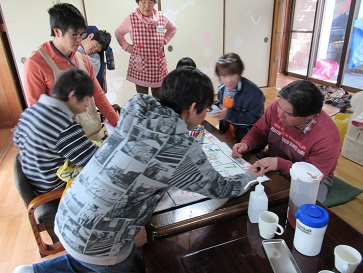 出品する前に着れそうな服を利用者さんと一緒に試着しています。