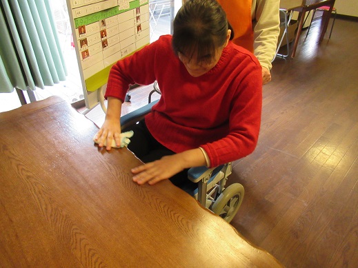 今日は利用者さんに色々と掃除を手伝って貰い、午前は机の拭き掃除を手伝ってくれました。