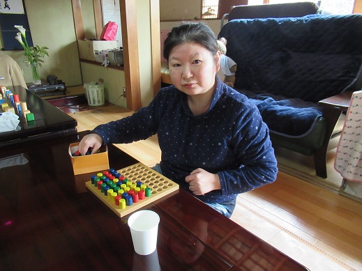 介護に関する話題が書かれたカルタを利用者さんが一つ一つ読まれています。