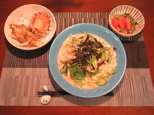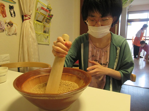 調理のお手伝いもやりました。ランチのうどんに使用するゴマをすって貰いました。