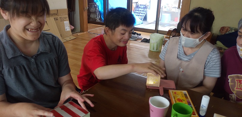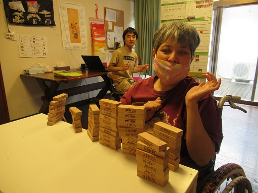利用者さんが右手で触っているのが来月の祝日の時に製作予定の工作です。