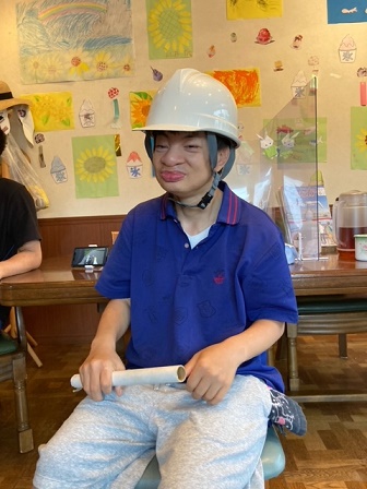 ヘルメットを被り、棒をハンドルに見立ててバイクの動画を鑑賞されていました。