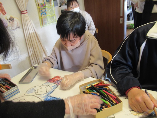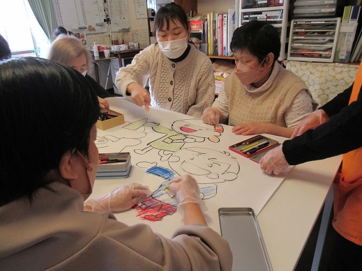 今日は節分がテーマの巨大絵に色塗りをしていきました。
