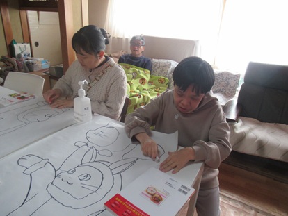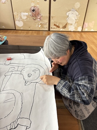 午前中に、昨日利用者さんに書いて貰った、巨大絵の下書きを他の利用者さん達と協力して消しゴムで消してもらいました。