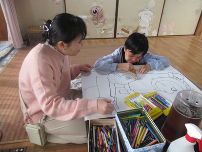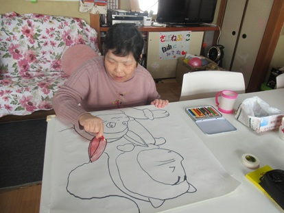 午前中は散歩に行かれる方と和室で巨大絵の色塗りをされる方で分かれていました。