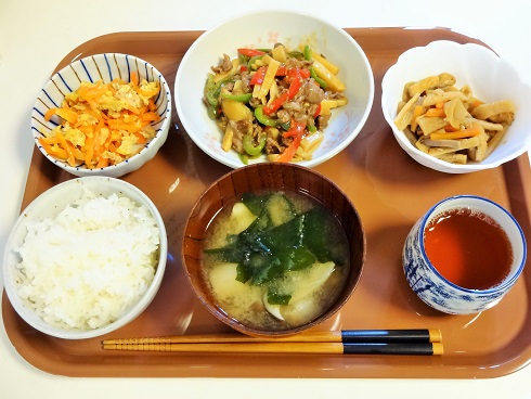 チンジャオロース、にんじんしりしり、割り干し大根の煮物、麩のみそ汁